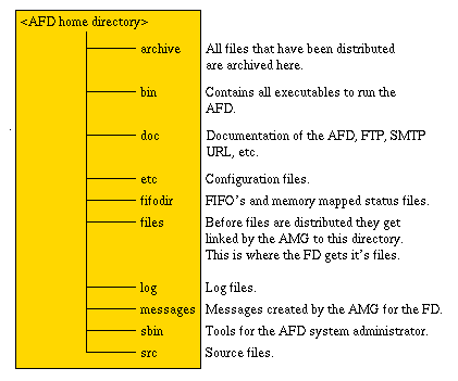 It is not necessary to have the bin and sbin directory here. They can be located at any place but should be in the PATH environment variable. So it is possible to run several AFD's using the same set of binaries. In fact it is more common to have these in /us/bin and /usr/sbin, then there is no need to change the PATH variable.